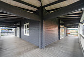 Первый этаж: кухня - столовая, гостиная со вторым светом, котельная и санузел. Выход на террасу, которая расположена по всеми периметру первого этажа дома;