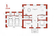 Первый этаж: прихожая, гардеробная, постирочная, санузел, спальня, кухня - столовая -гостиная, выход в гараж на два автомобиля, котельную и кладовую
