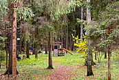На участке посажены сосны и выстелен газон. Просторный участок позволяет организовать дополнительные зоны отдыха.
