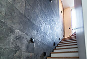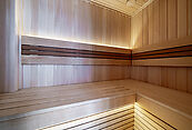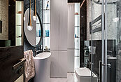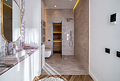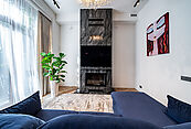 Итальянский и испанский керамогранит, для отделки санузла в мастер-спальне применялся слэб оникса, действующий дровяной камин, финская сауна.