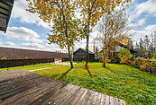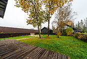 На участке выполнена планировка, сделан дренаж, засеян газон, высажены плодовые деревья, а посередине участка растет могучая липа, защищающая жителей дома своей тенью, в жаркий солнечный день.