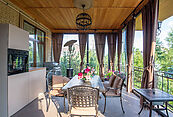 Первый этаж: гостиная с камином, кухня - столовая, кабинет, холл, гардеробная, домашний кинотеатр, постирочная, санузел, терасса - зимний сад.