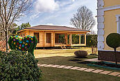 Установлена отдельно стоящая одноэтажная современная баня из кедра 72 кв.м. Баня очень гармонично расположена относительно других строений на участке, сохранения живописный вид из их окон.
