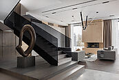 Первый этаж: кухня, кабинет, зона для приёма гостей, гриль‑зона, SPA‑зона с бассейном.