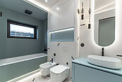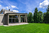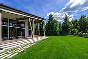 Первый этаж: прихожая, гардеробная, санузел, кухня-столовая-гостиная с выходом на террасу 90м2, постирочная, кабинет, гостевая спальня с санузлом, котельная, кладовая для спортивного и садового инвентаря, навес для авто;
