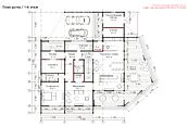Первый этаж: прихожая, большая гардеробная, гостевой cанузел, кухня-столовая-гостиная с выходом на террасу 90м2, постирочная, кабинет, гостевая спальня с санузлом, котельная, кладовая для спортивного и садового инвентаря, навес для авто;