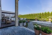 Первый этаж - прихожая, гардеробная, гостевой с/у, гостиная с выходом на террасу, кухня-столовая, кладовая, гостевая спальня с с/у, СПА с сауной, хаммамом, комнатой отдыха и выходом на террасу, гараж на два машиноместа.