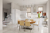 Первый этаж: холл, гостиная со вторым светом и камином, столовая выходом на террасу, кухня, спальня с гардеробной и санузел с ванной, спортзал - игровая, гостевой санузел, техническое помещение