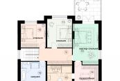 Первый этаж – прихожая, постирочная, санузел, спальня, гостиная, кухня-столовая, терраса, кабинет.