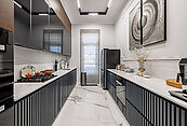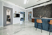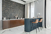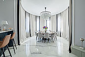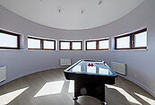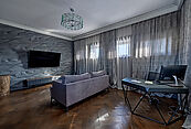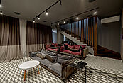 Первый этаж: холл, гостиная с выходом на террасу, столовая, кухня, спальня с санузлом, кинотеатр с лестницей на второй этаж (которая ведет в кабинет), гостевой санузел с зоной постирочной, гардеробная, котельная;