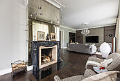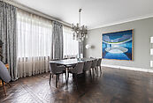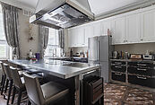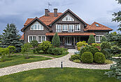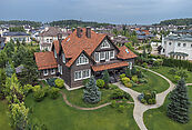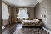 первый этаж: прихожая, гардеробная, гостевой санузел, гостиная с выходом на террасу, каминная-столовая, основная кухня и техническая, кабинет, спальня со своим санузлом, технические помещения: серверная, котельная, два независимых гаража на 4 автомобиля с квартирой для персонала на втором этаже
