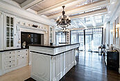 Гостиная с камином плавно переходит в обеденную зону с выходом на террасу — сердце дома для встреч с семьей и друзьями, 2 кухни, в том числе рабочая.
