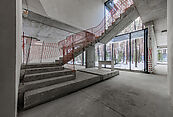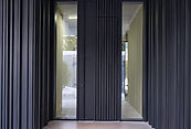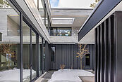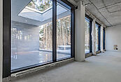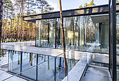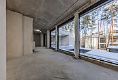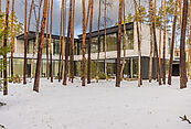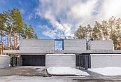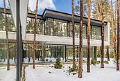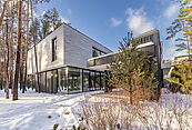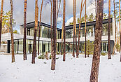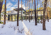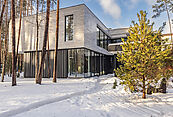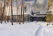 Первый этаж: холл с проходной гардеробной и гостевым санузлом, кухня-гостиная с выходом на улицу к зоне барбекю, гостевая спальня с собственной ванной комнатой, техническая кухня, постирочная, серверная/кладовая, гараж на 3 м/м, котельная с входом с улицы и лестницей на второй этаж в блок персонала;