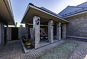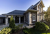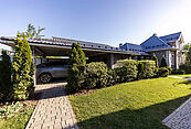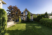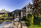 Помимо основного дома, на участке расположен гостевой дом, а также навес для автомобилей с подсобными помещениями. Выполнен ландшафтный дизайн, сделана дренажная система, высажено большое количество кустарников и хвойных деревьев.