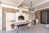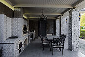 Первый этаж: кухня, гостиная, санузел, терраса, зона барбекю