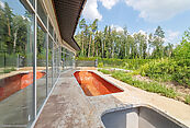 Первый этаж: прихожая, гардеробная, гараж, санузел, котельная, кухня с кладовым помещением, гостиная с выходом на задний двор с бассейном, спальня с ванной комнатой, спа-зона с бассейном;