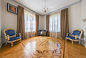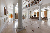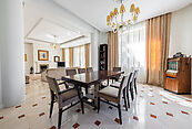 Первый этаж: прихожая, парадный холл, гостевой санузел, спальня, котельная, гараж на два машиноместа, терраса, кладовая, кухня, каминный зал, столовая;