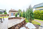 Участок, на котором расположен дом, имеет правильную прямоугольную форму и площадь 6 соток. Выполнен полный ландшафтный дизайн и озеленение: здесь растут селекционные плодовые деревья и кустарники, а аккуратно подстриженный газон и туи создают атмосферу уюта и спокойствия. Для отдыха на свежем воздухе предусмотрено патио с зоной BBQ. Дорожки на вымощены брусчаткой, выполнено освещение и авто-полив. Важно отметить удобную парковку, способную вместить до четырех автомобилей. Въезд на участок оснащен автоматическими воротами для максимального комфорта.