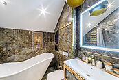 В доме, несмотря на не очень большую площадь разместилось четыре спальни. На втором этаже располагаются три из них: мастер спальня со своей гардеробной и две изолированные комнаты, просторный санузел второго этажа располагает душевой и отдельно стоящей ванной для максимального комфорта.