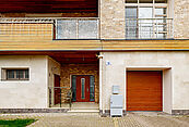 На участке выполнен ландшафтный дизайн. Перед въездом гараж предусмотрена открытая парковка на 2 машины.