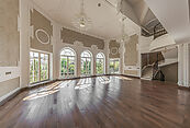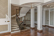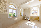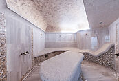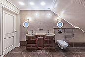 Цокольный этаж: спа зона с бассейном, хамам, баня на дровах с зоной отдыха и душевой и выходом во двор, санузел, кухня для персонала, две комнаты свободного назначения, прачечная, щитовая, котельная, серверная, две кладовые комнаты