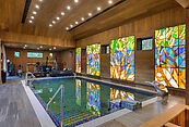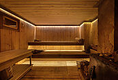 Первый этаж: бассейн 9*4 м с противотоком, джакузи, русская баня на дровах, хаммам, две купели, раздевалка с душевой, комната отдыха с камином, помещение под барбекю и большая терраса на улице.