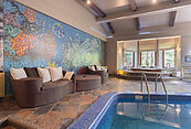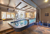 Первый этаж: прихожая, гардеробная, холл, гостиная, кухня-столовая, кладовая, кабинет, зимний сад, терраса, бассейн, русская баня, раздевалка, гостевая спальня, гардеробная, санузел