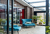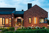 Архитектурный шедевр, в котором хочется жить. Фасад дома, одетый в уникальную кладку из трех оттенков кирпича Faber-Jar, играет объемом и глубиной, создавая неповторимый образ английского стиля. Его визитная карточка — грандиозный витраж и панорамное остекление, которое стирает границу между изысканным интерьером и природой вашего сада.