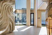 В доме выполнен дизайнерский ремонт. Панорамное остекление наполняет внутреннее пространство естественным светом и ощущением единства с природой. Интерьер выполнен в современном стиле, в светлых, мягких пастельных тонах.