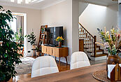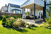 Первый этаж: холл с зоной гардероба, санузел, кухня-гостиная-столовая с выходом на террасу,
