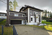 Первый этаж: тамбур, парадный холл, две гардеробные, гостевая спальня с ванной, кабинет, гостевой санузел, гараж на 2 м/м, котельная, две кладовые;