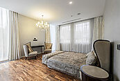 Второй этаж: мастер-спальня с ванной комнатой, гардеробной, выходом на балкон и на лестницу, ведущую на кровлю, мастер-спальня с ванной комнатой, гардеробной и выходом на террасу, две спальни с вынными комнатами и гардеробными, кабинет.