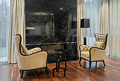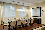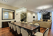 Благодаря высоким потолкам и панорамному остеклению в доме много воздуха и света. Над проектом работал профессиональный архитектор, выполнен дорогой и качественный ремонт, в отделке использованы ценные экзотические породы дерева и натуральный мрамор.