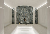 Цокольный этаж: две гостевые спальни с одним санузлом; зона отдыха (спортивный зал, хамам, кинотеатр/бильярдная); сезонная гардеробная, кладовая; блок для персонала с отдельным входом (2 спальни).
