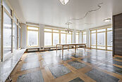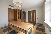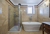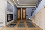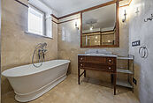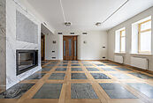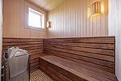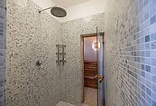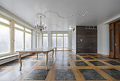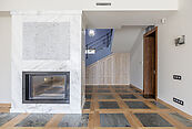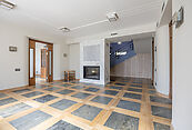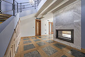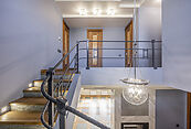 Внутреннее пространство вмещает просторную столовую с большим столом и панорамными окнами, уютную гостиную с двухсторонним мраморным камином, 4 спальни, 1 кабинет и сауну.