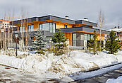 Просторный участок площадью 25 соток с хвойными и лиственными деревьями позволяет воплотить любые ландшафтные задумки. Современный многоуровневый фасад с отделкой из дерева, камня и темных панелей гармонично вписан в природное окружение. На придомовой территории уже выполнены дорожки и установлено декоративное ограждение с воротами. Развитая инфраструктура поселка и его близость к столице делают это место идеальным для постоянного проживания.