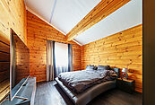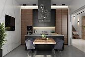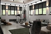 Планировка дома включает в себя просторный зал с обеденной зоной, четыре комфортные спальни и зону отдыха, обеспечивая достаточное место для всей семьи и гостей. Высокие потолки, достигающие 3,5 метров, и большие окна придают комнатам ощущение простора и воздушности.