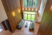 Ощущение пространства в доме обеспечивает большая площадь остекления и высота потолков в комнатах от 3,5 до 7,2 м.