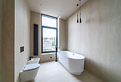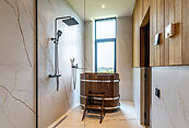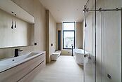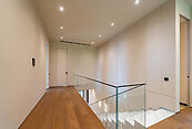 Приватная зона: мастер-блок 81 кв. м (спальня, две гардеробных 18 кв. м и 14 кв. м, санузел), три детских блока площадью 44, 55 и 56 кв. м (четкое зонирование, выделяющее кабинет-игровую-гардеробную, детскую и полноценный санузел с окном, ванной, душевой, умывальником, унитазом и биде), прачечная.