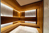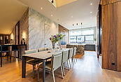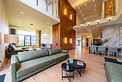 Общественная зона: Полностью укомплектованная мебелью гостиная-столовая-кухня - единое пространство со вторым светом, общей площадью 115 кв. м и объемом - 570 куб. м (выделено 5 функциональных зон: медиа зона с ТВ и дровяным камином, лаунж зона с двумя большими диванами, столовая со столом на 8 персон (с возможностью увеличения до 20), зона бара с двумя сервантами и барной стойкой, парадная кухня с островом 20 кв. м (с доступом в рабочую кухню 12 кв. м)). Окна этого пространства смотрят на восток, юг и запад. Блок свободного назначения с санузлом и сауной (общая площадь блока 37 кв. м, комната может использоваться как игровая, СПА, спортзал, кинотеатр, бильярдная и т.д.). Крытая терраса с видом на лес с доступом из кухни и столовой. Хозяйский санузел первого этажа, оснащенный умывальником, унитазом, биде и писсуаром.