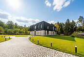 Одно из лучших расположений в поселке – первая линия от леса и вдали от транзитных дорог. Посадка дома учитывает соседние дома и обеспечивает вид на лес из окон трех сторон.
