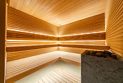 Первый этаж: холл, гостиная со вторым светом, столовая, кухня, кладовая, две гардеробные, три санузла, спальня с ванной комнатой, постирочная, кабинет, бассейн, хаммам, купель, сауна, терраса, котельная, гараж на два автомобиля;
