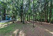 На участке 17,5 сотки сделан ландшафтный дизайн: высажены деревья и декоративные кустарники; при этом сохранена и лесная часть. Помимо гаража на придомовой территории организована дополнительная парковка. Участок полностью огорожен, установлены ворота с электроприводом.