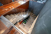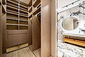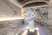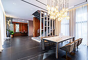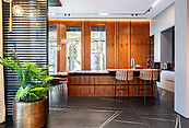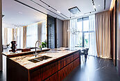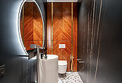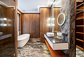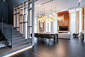 Интерьер создан студией Prosvirin Design и сочетает натуральные материалы и высокие технологии. В отделке использованы кварцит, редкие породы дерева, итальянская сантехника CEA и Antonio Lupi, свет от Центрсвет и ведущих итальянских брендов.