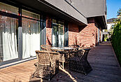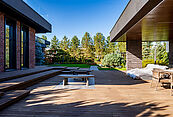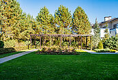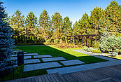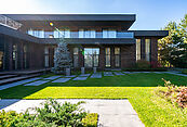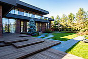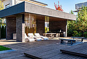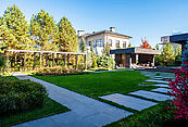 На участке выполнен ландшафтный дизайн с перголами, зелёными изгородями и уютными дорожками. Просторная терраса приглашает к отдыху на свежем воздухе и становится естественным продолжением дома в летние месяцы. Уличная кухня оборудована техникой Bosch и грилем Napoleon, что делает летние вечера особенно приятными.