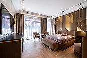 Второй этаж: мастер-спальня с гостиной зоной, гардеробной и санузлом, спальня с санузлом и гардеробной, кабинет/спальня, гостевой блок с отдельным входом, с кухней-столовой, спальней,