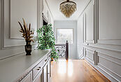 Первый этаж: прихожая, гардеробная, кухня - столовая, гостиная, зимний сад, кабинет, кладовая комната, санузел. Проход в отдельный блок, где на первом этаже расположена котельная, серверная, прачечная, выход в гаражи, а на втором этаже две спальни и санузел.