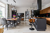 Дом построен по индивидуальному проекту с использованием дорогостоящих натуральных материалов. Напольное покрытие - австрийский дуб, гардеробные, лестница и входные группы - дерево орех. В доме есть вся необходимая мебель и встроенная техника для постоянного проживания. Мебель фирмы Bordignon Camillo и техника от Kuppersbusch. Достаточно большое количество комнат, а их в основном доме доме 5, позволит разместиться даже большой семье.