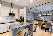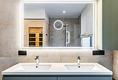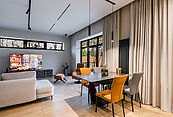 Дом построен из энергоэффективных керамоблоков Porotherm, облицован фиброцементными панелями Nichiha и KMEW, перекрытия — железобетон. Выполнен с использованием премиальных материалов и инженерных систем: магистральный газ, электричество 30 кВт, автономная вода, ЛОС большой мощности, видеонаблюдение, сигнализация с выездом Росгвардии. Полы с подогревом, вентиляция с рекуперацией, кондиционирование, «умное» управление.