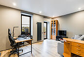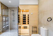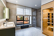Второй этаж: мастер-спальня с гардеробной и санузлом (сауна, душ), спальня с выходом на террасу и санузлом с ванной, кабинет-библиотека, постирочная, кладовая.